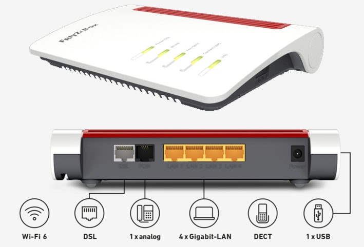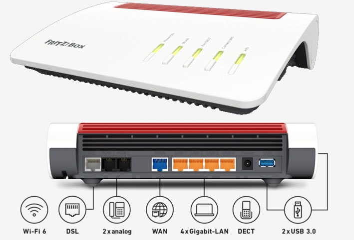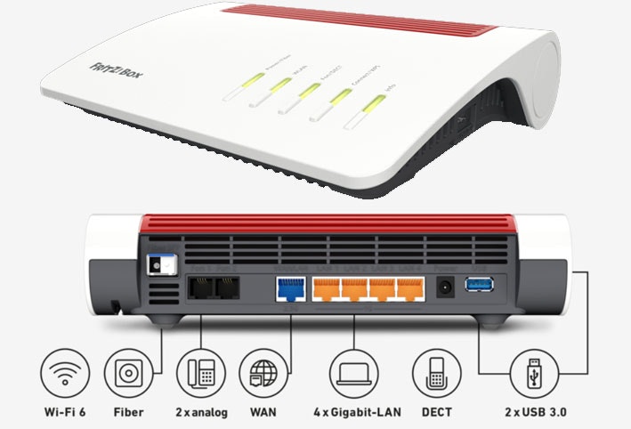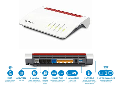 Glasfaser, WIFI 6 bis 2.400 MBit/s +1.200 MBit/s, Dual-WLAN (2,4 GHz, 5 GHz), Netzwerk mit 4x Gigabit LAN, 1x 2,5 Gigabit WAN, Telefonie, DECT, 2x USB 3.0